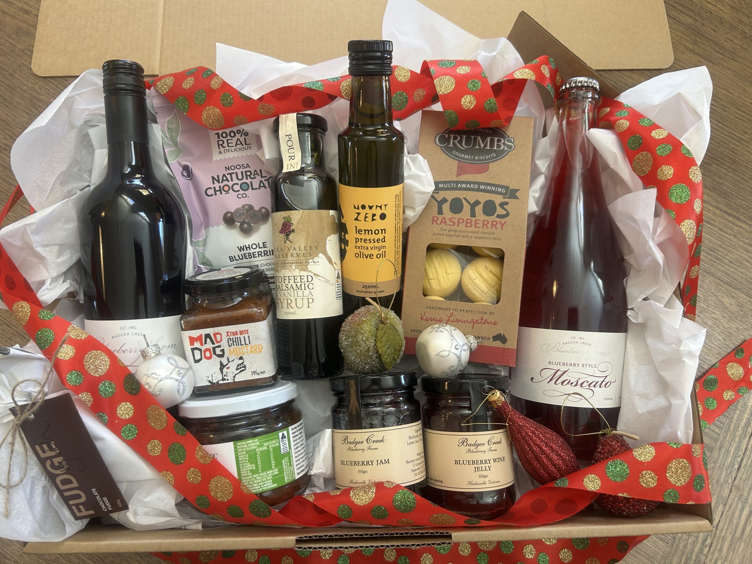 Our Christmas Hamper Includes: Blueberry Moscato, Blueberry Wine, Blueberry Jam, Blueberry Wine Jelly, Cunliffe and Waters Christmas Chutney, Crumbs – Raspberry Yo-yo, Chocolate coated blueberries, Mad Dog Chilli Mustard, Fudge by Rich Fudge, Mt Zero Olive Oil & Yarra Valley Gourmet Foods Toffee Balsamic vinegar.